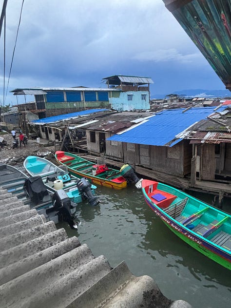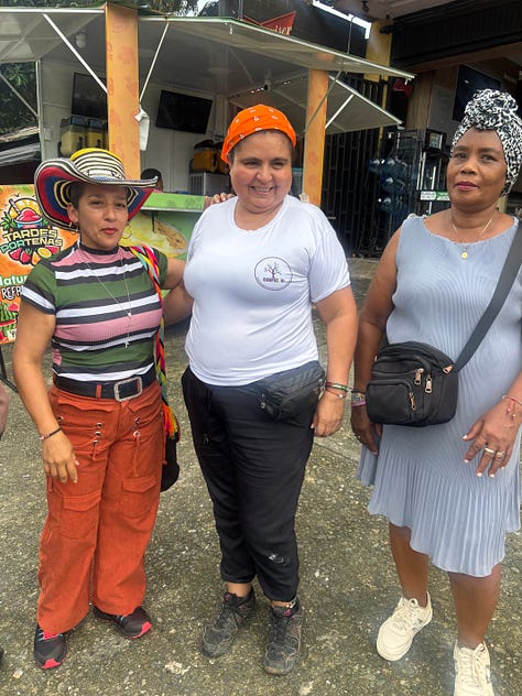 Every time I am with Maru (Maria Eugenia) — this time too — she is sending off capable, fearless, fighting vibes. No kidding. There is an enormous target painted permanently on her back. Colombia had more human rights and land defenders killed in 2023 than anywhere else on earth. In 2022 Maru was given the Women Building Peace award by the US Institute of Peace. Last year — not for the first time — she received direct death threats, had a gun pulled on her. Like Abilio, last time I was with her she had state-appointed bodyguards. Not today. Just us. She is travelling with Candelaria, from Choco, and Martha (my seat-mate with the fuzzy white sweater). Also returning from human rights meetings in Bogotá are four other local Buenaventura folks. And a wandering Chicano-Puerto Rican-Chicagonean who was supposed to be working here with the communities, until the USAID money collapsed.